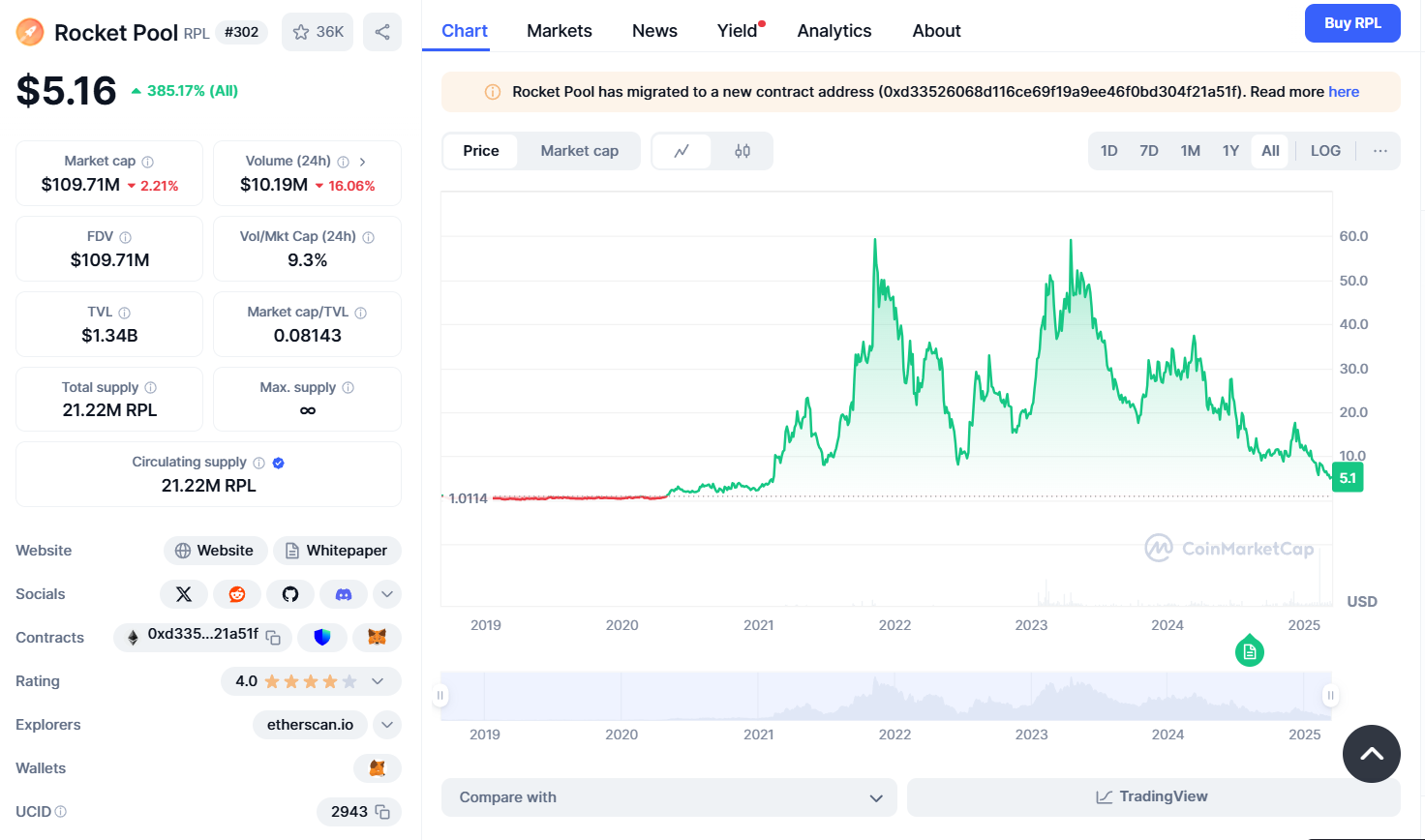 As of March 14, 2025, the price trading of Rocket Pool (RPL) is $5.16, which is much lower than the previous day by 2.21%.